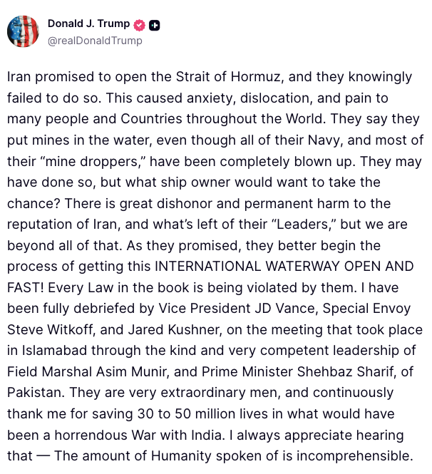 En un siguiente post, reiteró su demanda de que Irán haga completamente operativo el estrecho de Ormuz, una importante ruta de tránsito de petróleo.