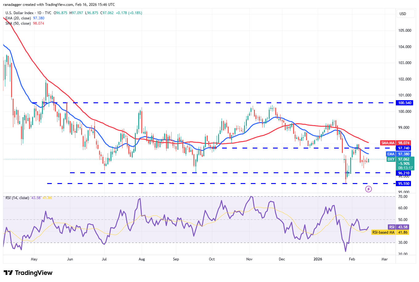 El índice del dólar estadounidense (DXY) ha estado cotizando por debajo de las medias móviles, pero los osos no han logrado desafiar la zona de soporte de 96.21 a 95.55.