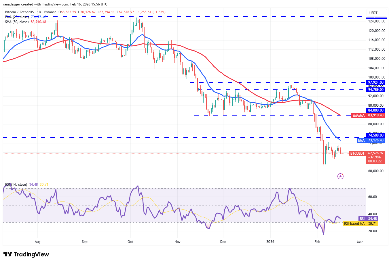 Los compradores deberán llevar el precio de Bitcoin por encima del nivel de ruptura de $74,508 para señalar que el impulso bajista se está debilitando. El par podría luego dispararse hacia la media móvil de 50 días ($83,910), donde se espera que los osos fortalezcan su defensa.