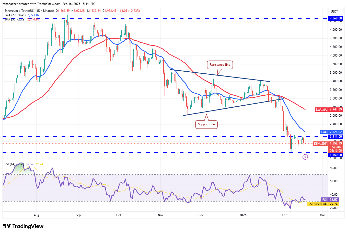 Ether (ETH) volvió a caer del nivel de $2,111 el domingo, lo que indica que los osos defienden ferozmente ese nivel.