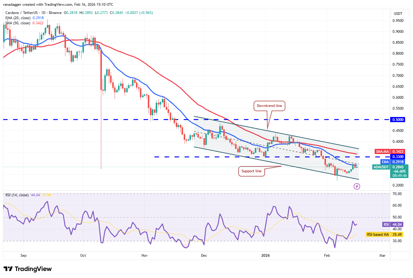 Si los toros no ceden terreno a los osos, la posibilidad de una ruptura por encima de la EMA de 20 días aumentará. Esto sugiere que el par ADA/USDT podría permanecer dentro del canal descendente por más tiempo. Una ruptura y cierre por encima de la línea de tendencia bajista señalizará un posible cambio de tendencia a corto plazo.