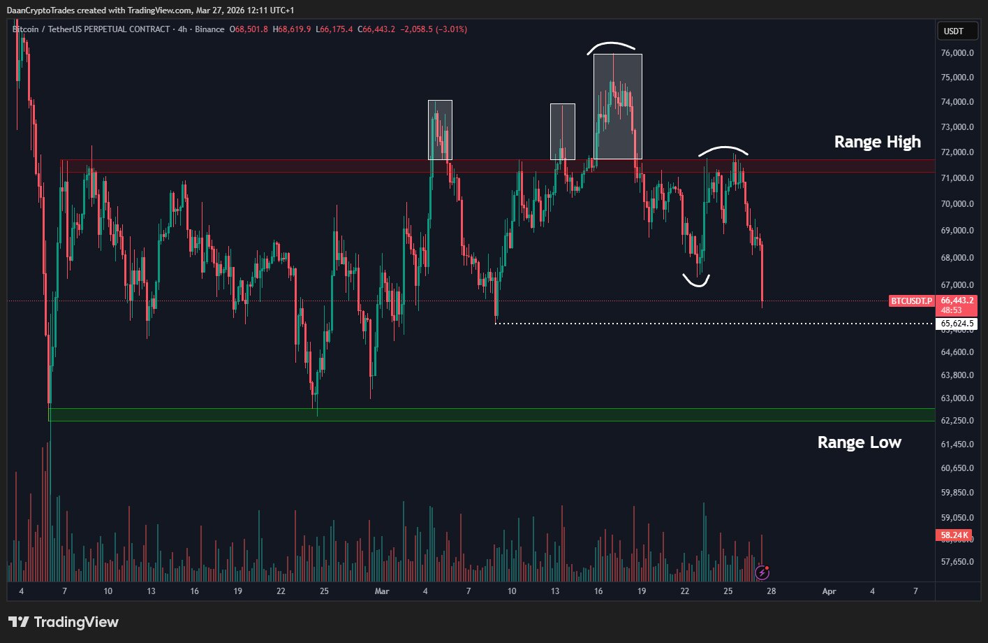 “Fíjate en ese mínimo de $65.6K del lunes de la semana pasada. La principal área que debo observar será el mínimo del rango. Aún hay bastante liquidez alrededor de esa área.”