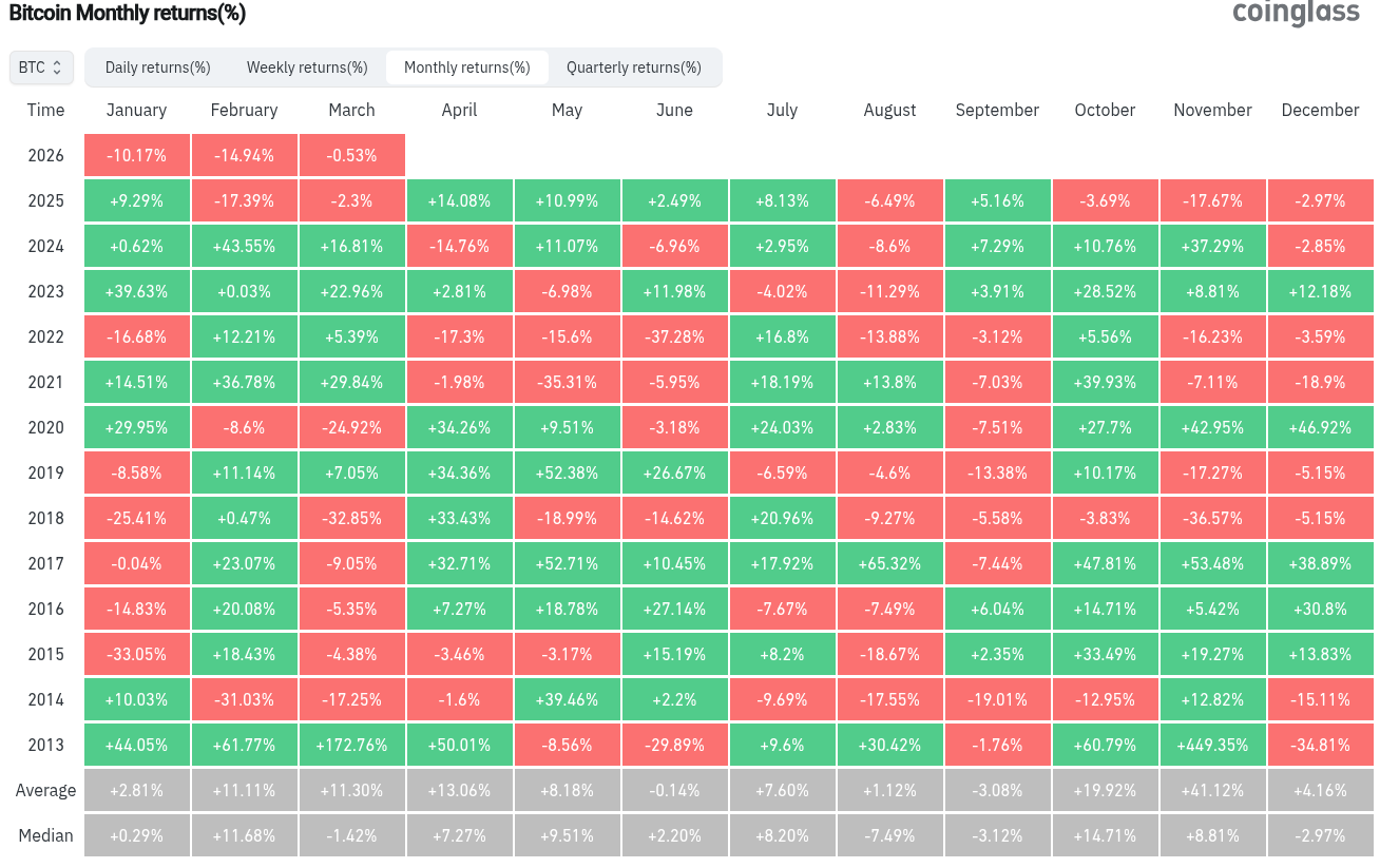 El rendimiento del precio de BTC está a punto de sellar su sexto mes consecutivo de pérdidas al cierre de marzo.