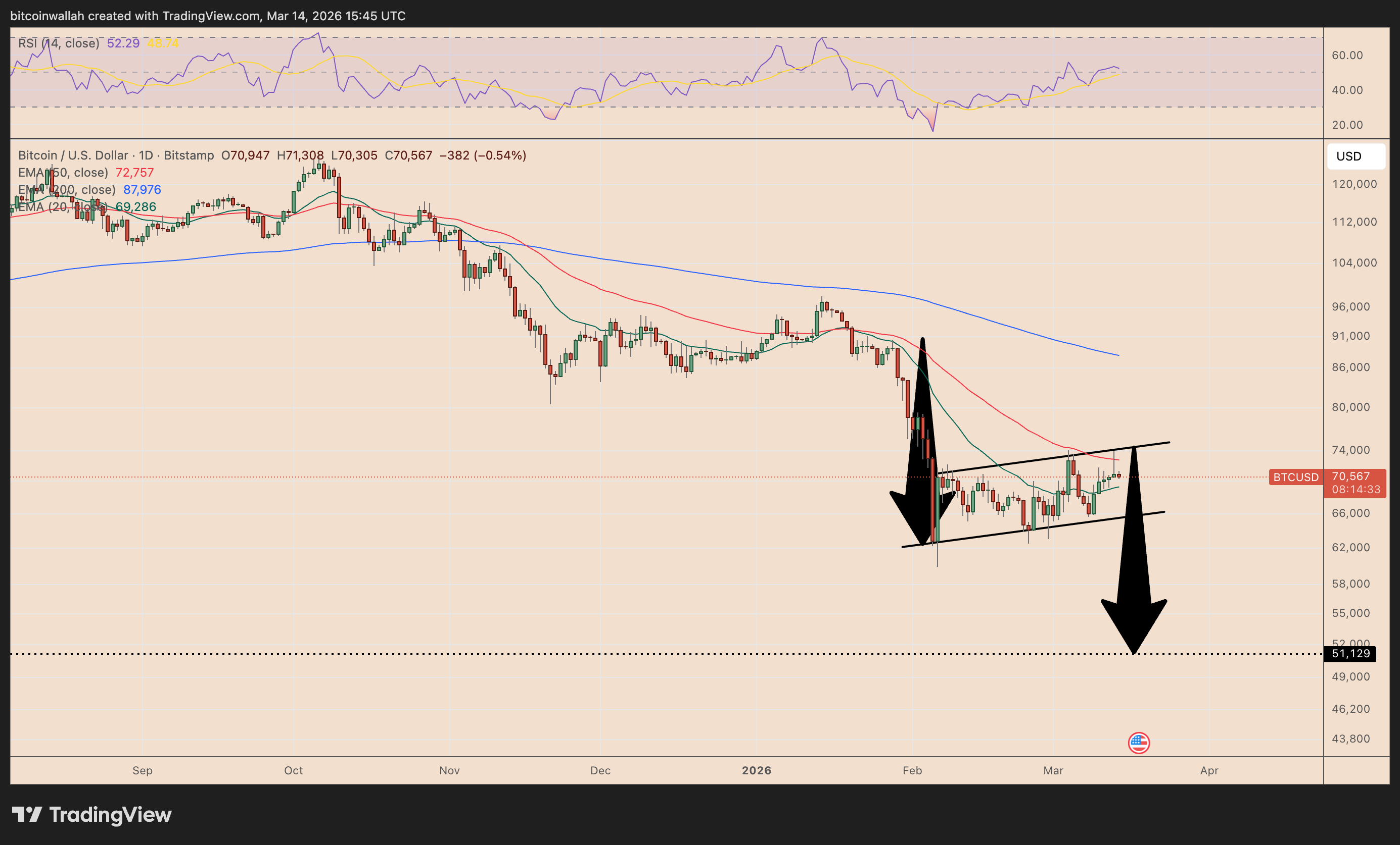 Aplicando el principio de la bandera bajista al gráfico de Bitcoin, se sitúa el objetivo a la baja en aproximadamente $51,000.