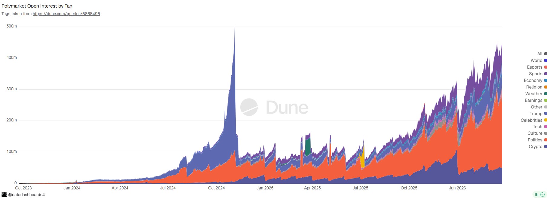 El interés abierto en Polymarket alcanzó su punto máximo alrededor de octubre y principios de noviembre de 2024, durante las elecciones estadounidenses, de acuerdo con datos de Dune Analytics. Después de un brusco descenso inicial, ha seguido aumentando su popularidad, siendo la política el tema más popular, seguido por deportes y criptomonedas.