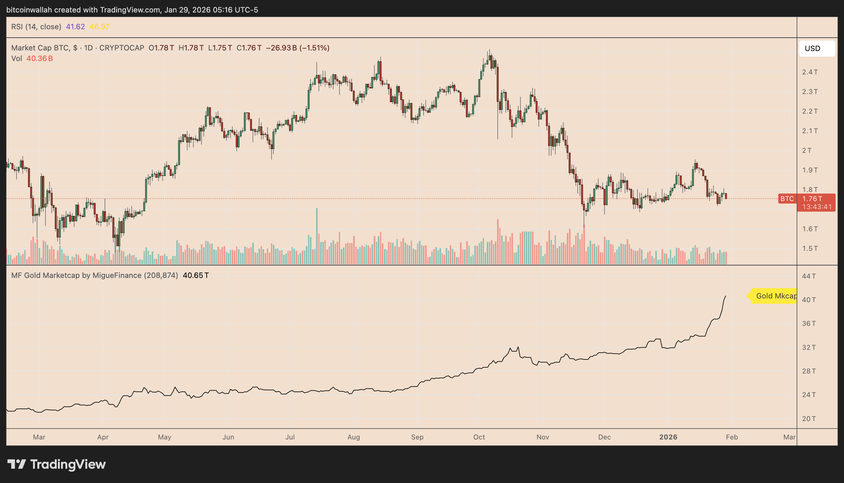 Al inicio de enero, el valor de Bitcoin representaba apenas el 4.30% de la capitalización de mercado del oro, que asciende a $41.69 billones.