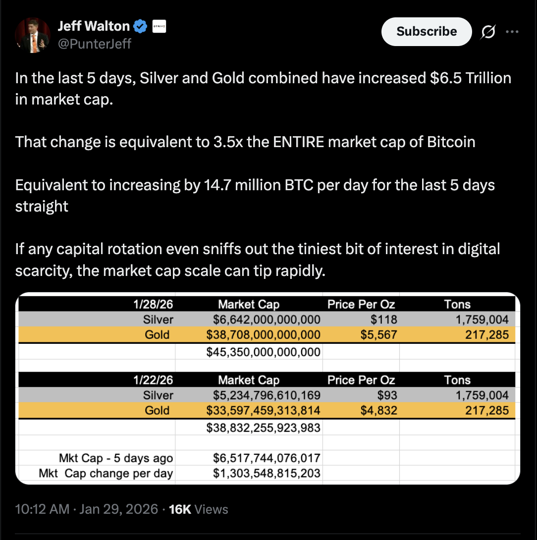 Según Jeff Walton, director de riesgos de Strive, una empresa de tesorería de BTC, Bitcoin solo necesita una pequeña porción de la demanda al estilo del oro para experimentar una rotación masiva hacia BTC.