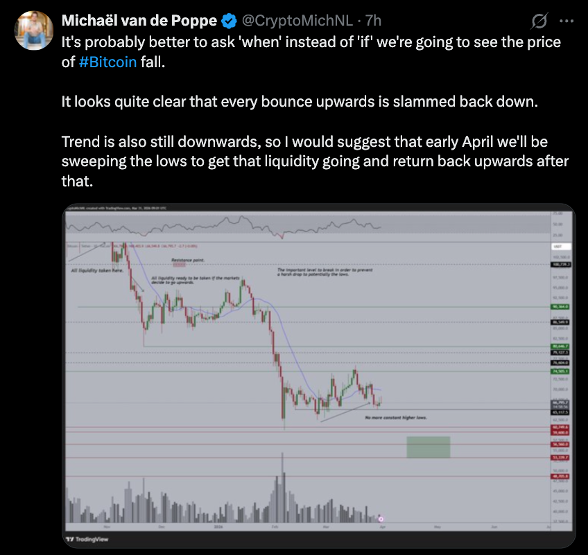 El fundador de MN Fund, Michael van de Poppe, también previó una reanudación de la tendencia bajista en el corto plazo. En una publicación en X, van de Poppe indicó: