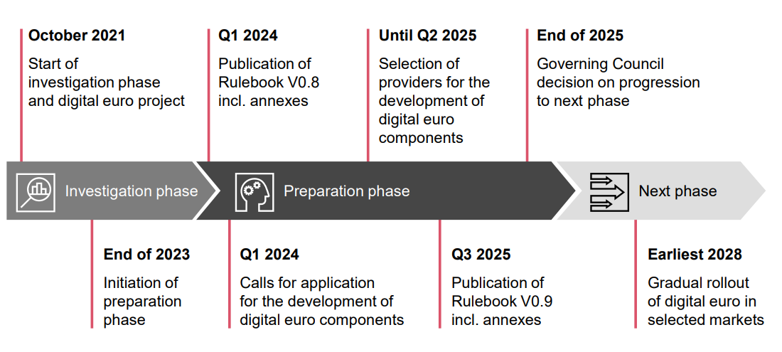 Línea de tiempo proyectada para el despliegue del euro digital. Fuente: PwC