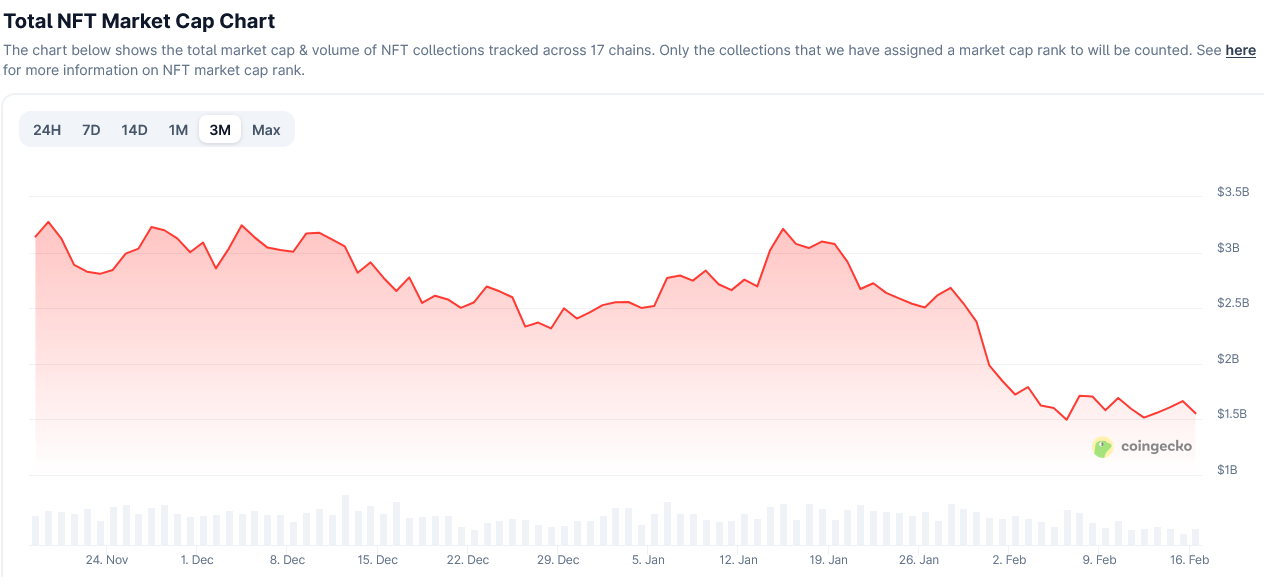 Mientras que el mercado de NFT comenzó fuerte en las primeras dos semanas de 2026, la capitalización total del mercado de NFT ha caído más del 50%, de 3.2 mil millones a 1.55 mil millones, en medio de un retroceso general del mercado.