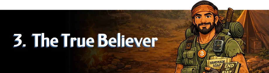 El apocalipsis no es una amenaza, es un plan. Esta persona no ha tocado el fiat desde 2018 y se baña exclusivamente en sats no KYC. Ha aprendido a hacer jabón, pescar y explicar el colapso monetario con un tono calmado y tranquilizador.
