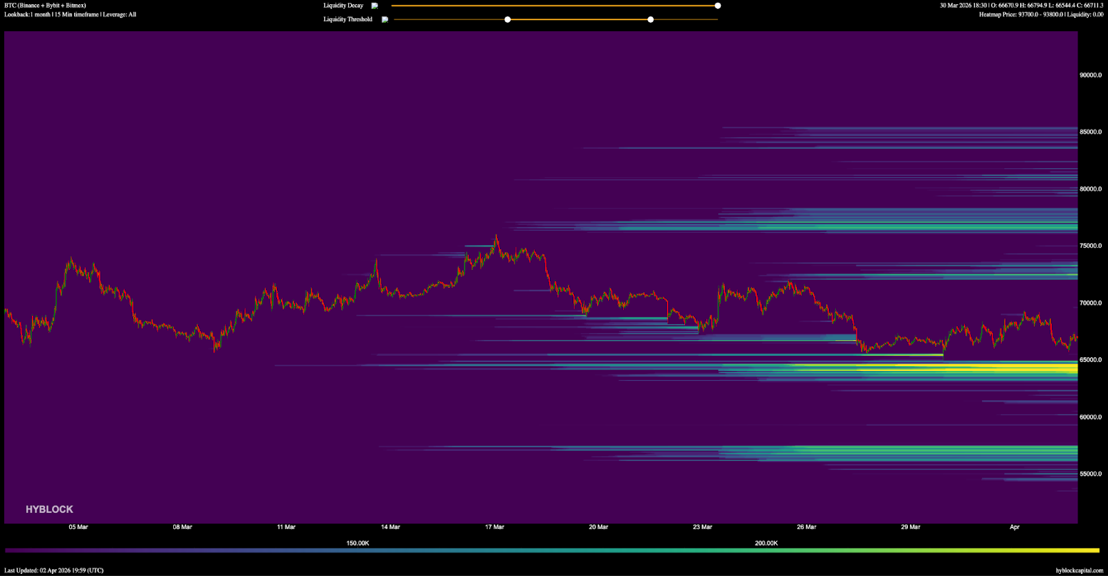 Con respecto a la predicción de Kibar de $52,500 y su alineación con los mercados de futuros de Bitcoin, los datos del mapa de calor de liquidación de Hyblock muestran un gran número de posiciones largas apalancadas en riesgo de liquidación si BTC cae en el rango de $63,000 a $65,000.