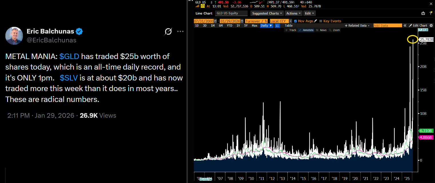 La caída de Bitcoin el jueves coincidió con una caída del 8% en los precios del oro en menos de 30 minutos, aunque el metal recuperó la mitad de esas pérdidas poco después. Eric Balchunas, analista senior de ETF en Bloomberg, señaló que el ETF de SPDR Gold Shares (GLD US) vio un volumen de negociación que superó los $25 billones el jueves, marcando un récord histórico.