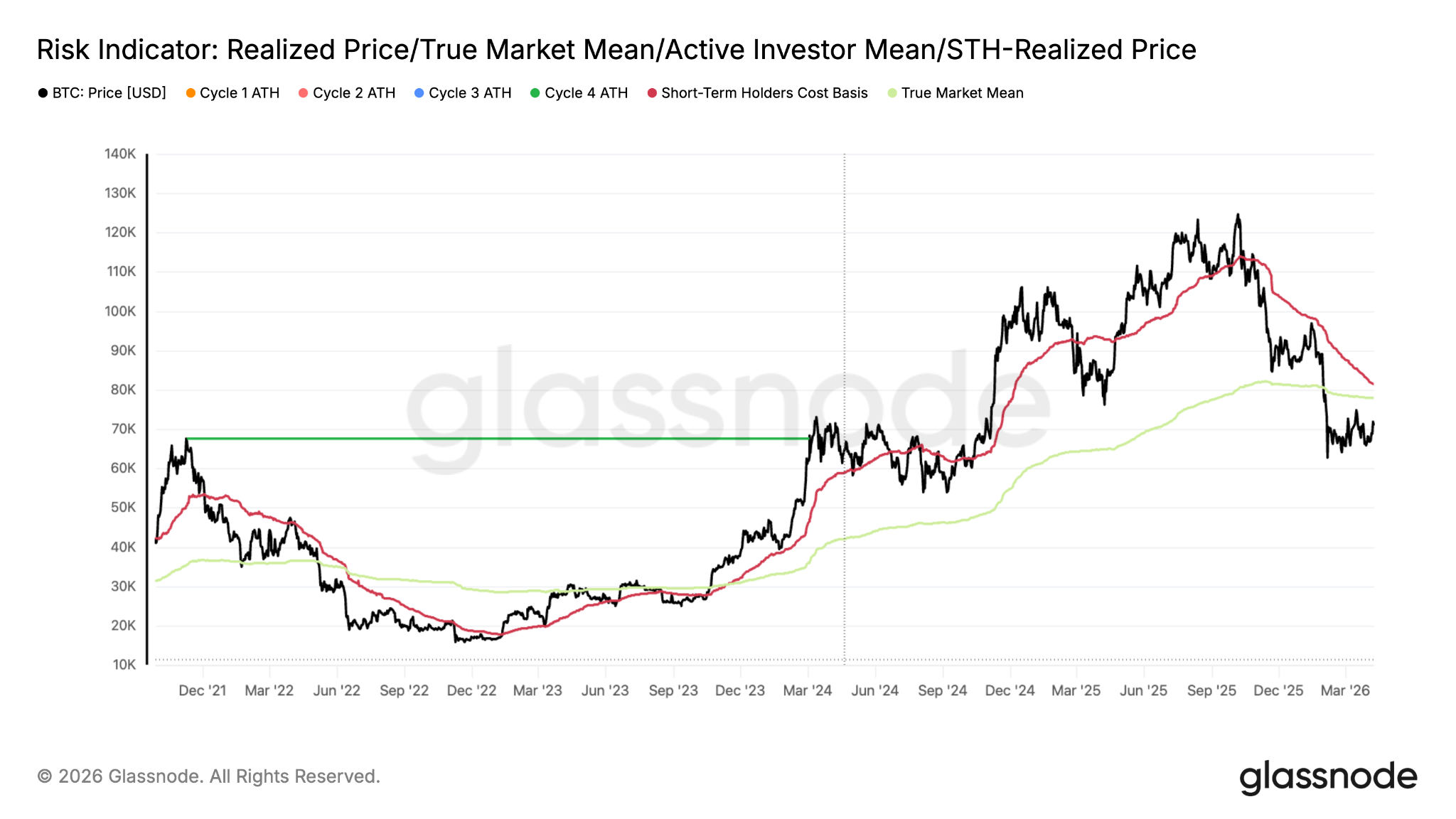 El indicador de riesgo de Glassnode revela otra resistencia importante más arriba, entre el verdadero promedio del mercado en $78,000 y el nivel de costo de los tenedores a corto plazo en torno a los $80,000.