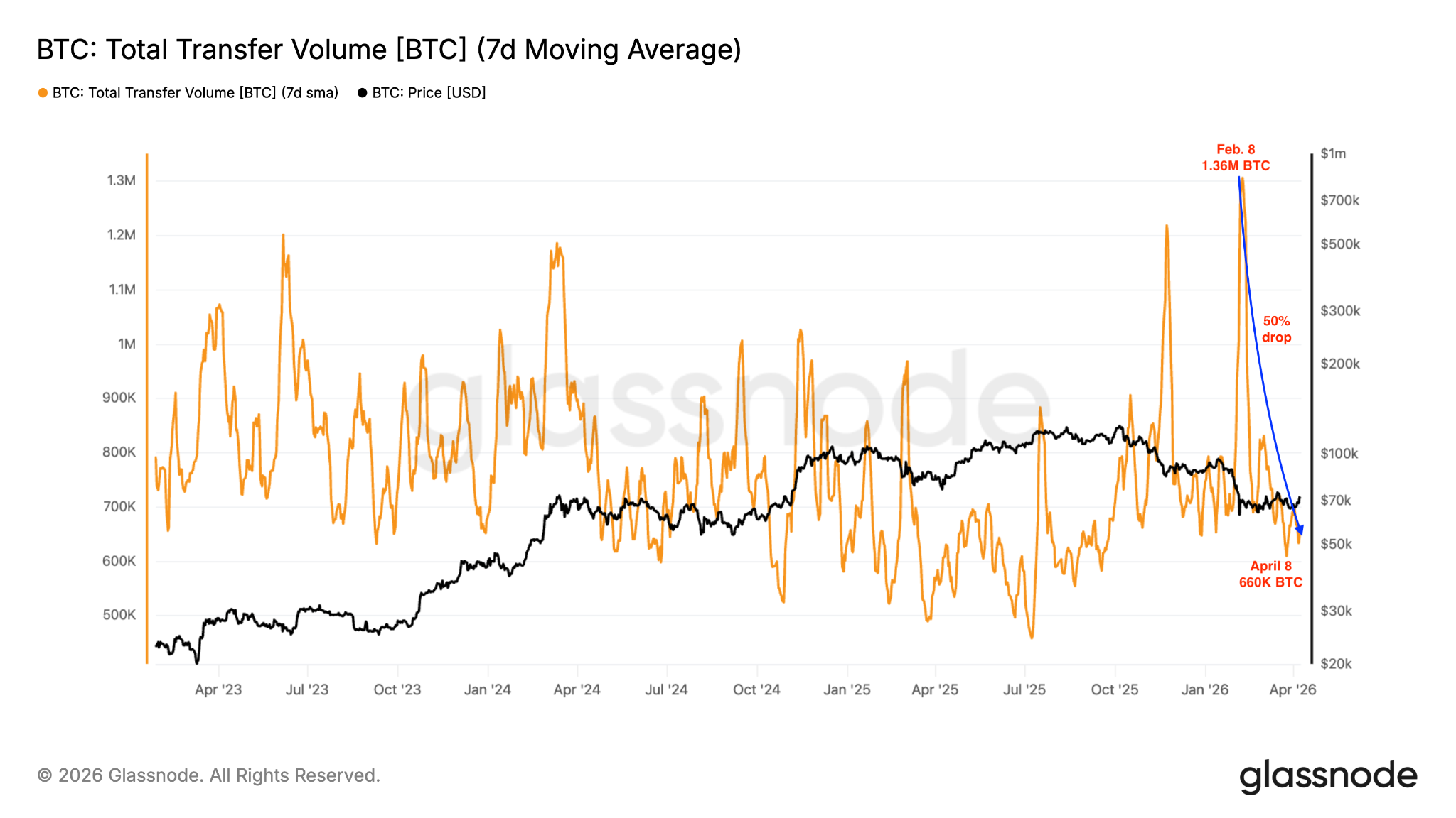 La media móvil de siete días del volumen de transferencia en la cadena ha caído aproximadamente un 50.5%, situándose en 660,000 BTC el jueves, en comparación con 1.36 millones de BTC hace menos de 30 días.